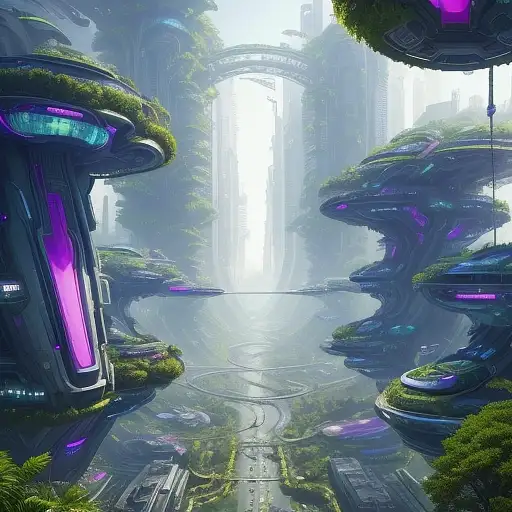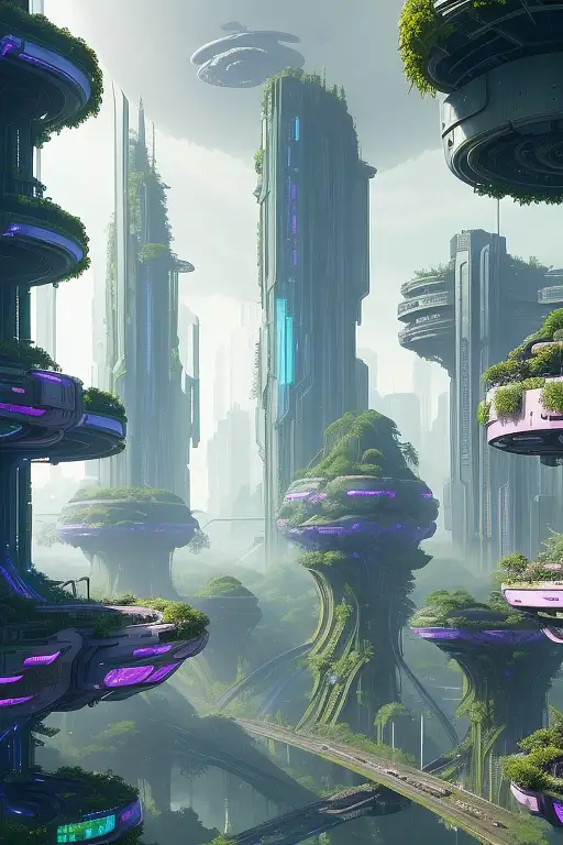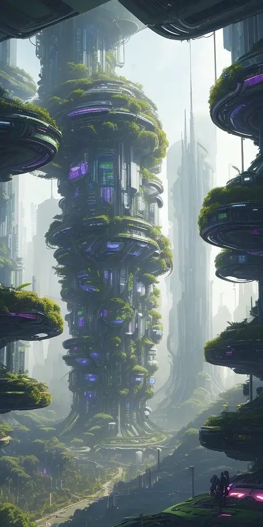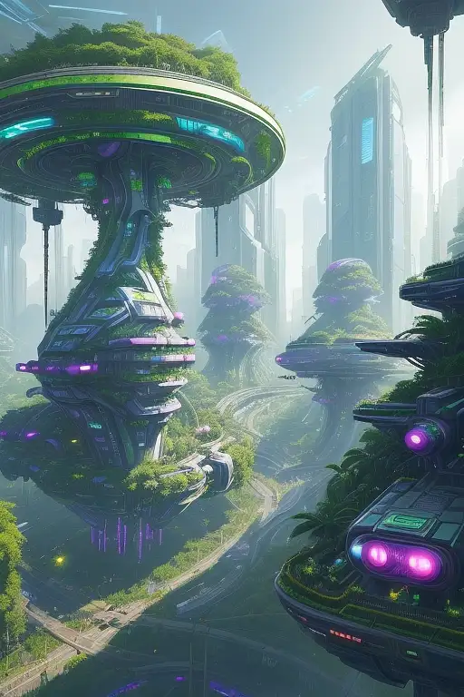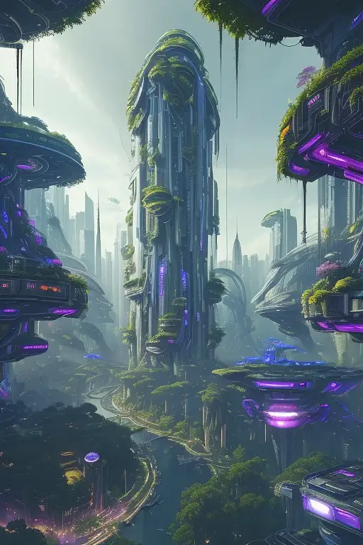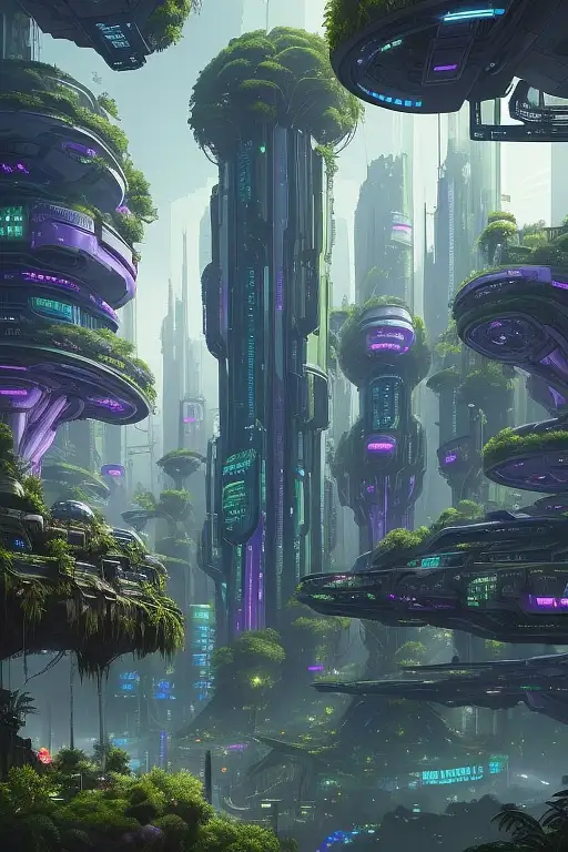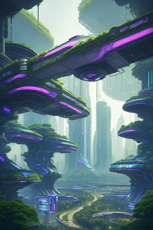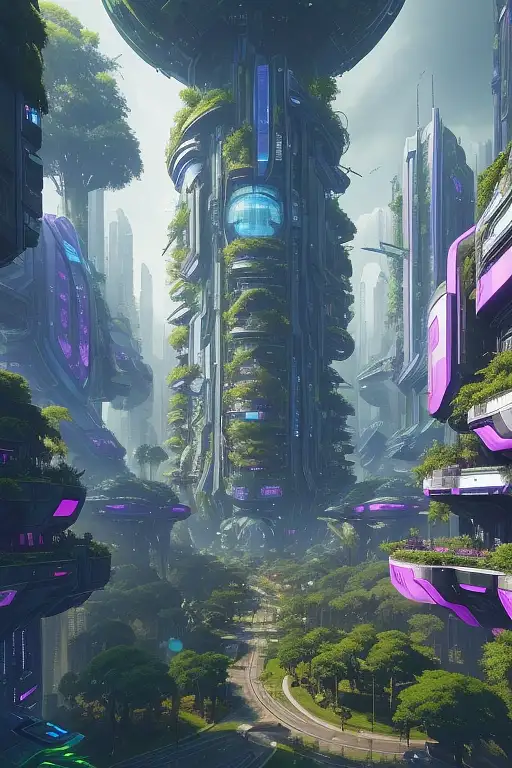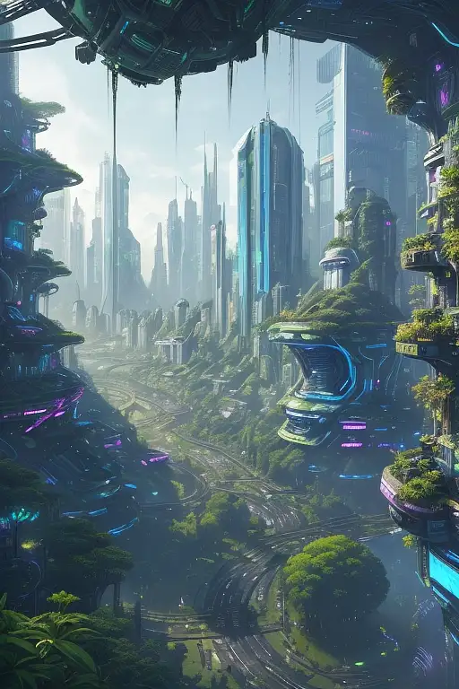 2 years ago a view of a city with a lot of trees and bushes, garden, a lot of flying objects , future city, in fantasy sci - fi city, in a cyberpunk garden, utopian jungle in space, rainbow color cyberpunk city, lush alien landscape, lush foliage cyberpunk, cyberpunk forest, cyberpunk dreamscape, cyberpunk in foliage with bridge connect together. d146a931451 0 51