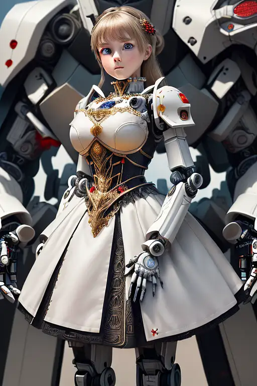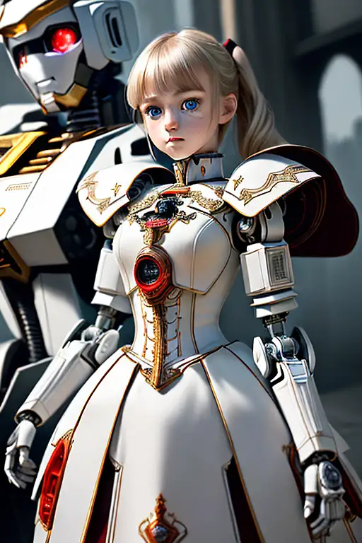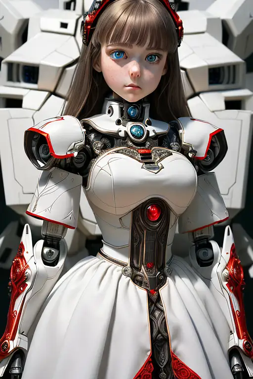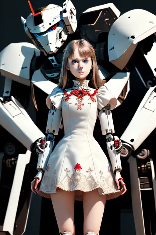 2 years ago (masterpiece:1.4, best quality), (intricate details), unity 8k wallpaper, ultra detailed, intricate details, super complex details, ((2people)), (girl_standing_beside_robot:1.2), girl, (perfect detailed face, detailed eyes, white dress), BREAK robot, (giant mecha, red and black armor, blue eyes, holding rifle), starry sky, skyline, <lora:Mecha:1>, <lora:Add More Details:0.8> d146a931451 0 19