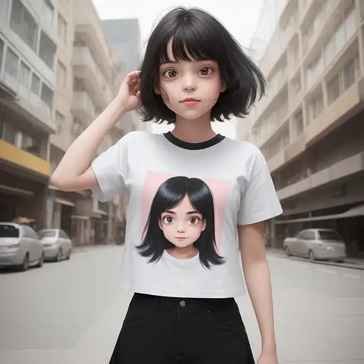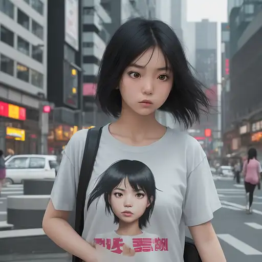 2 years ago 1girl, asian girl watching advertising broad, wearing t-shirt, black hair, city background d146a931451 0 14