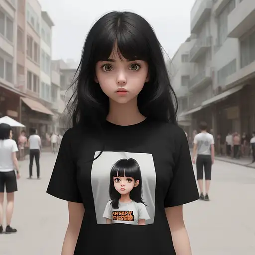2 years ago 1girl, a girl with cute watching advertising broad, wearing t-shirt, black hair, city background d146a931451 0 18