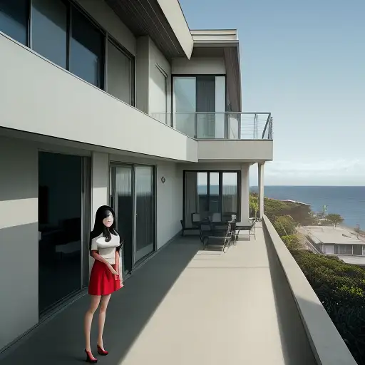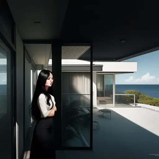 2 years ago Hyper realistic eye level exterior photo of a mid century modern style house overlooking the ocean, daylight, indirect lighting, AD magazine, 1girl, Asian girl watching advertising broad, black long hair, city background d146a931451 0 22