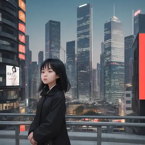 2 years ago 1girl, Asian girl watching advertising broad, black hair, city background d146a931451 0 23