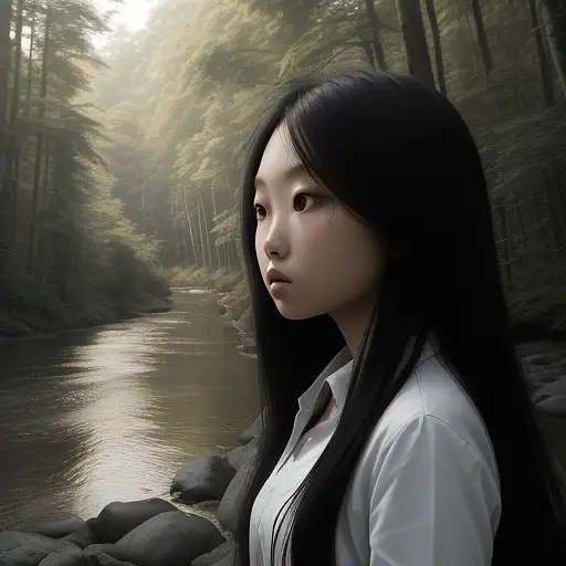 2 years ago daylight, indirect lighting, 1girl, Asian girl watching advertising broad, black long hair, river and forest background d146a931451 0 39