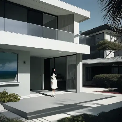 2 years ago Hyper realistic eye level exterior photo of a mid century modern style house overlooking the ocean, daylight, indirect lighting, AD magazine, 1girl, Asian girl watching advertising broad, black long hair, city background d146a931451 0 21