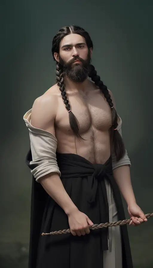 1 year ago A 24 year old human wizard. He is of average height and has green eyes and black hair. He has a wiry, athletic frame. His hair is shoulder length and tied back. His beard is short, with two braids extending to his collarbone. He is wearing fabric robes and wields an arcane staff. The background is featureless white. d1730e5d138 0 47