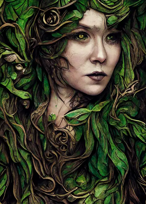 dryad made of tree bark, feminine, portrait, forest nymph, bald, demeanor fey and otherworldly, vines, leaves, black paper with green line work, gold layers, gothic, metallic, photorealistic, style of Charlie Bowater, style of Eric-Anthony Johnson, style of Bo Feng Lin, detailed, ornate, tarot card, artstation, portrait, in a mystical and symbolic style, ethereal, tree, wlop, in the style of artgerm, 8k resolution, realistic --w 2900 --h 4060 --video --test --no long neck --uplight