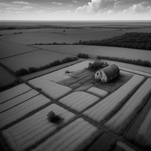 1 year ago illustration black-and-white of Aerial view of a farm in a post-apocalyptic setting inspired by 'The Last of Us'. The farmland is overrun by nature, with crops and wild plants growing chaotically together. The farmhouse and barns are dilapidated, their roofs partially caved in and walls covered in ivy. Rusting farm equipment is scattered around the fields, now serving as relics of a bygone era. Fences are broken and overgrown with vegetation. Amidst the wild growth, a few survivors have set up makeshift shelters, tending small, organized gardens for food. The scene is both serene and haunting, with a misty sky casting a gloomy yet peaceful atmosphere over the reclaimed land d2e691806ce 0 44