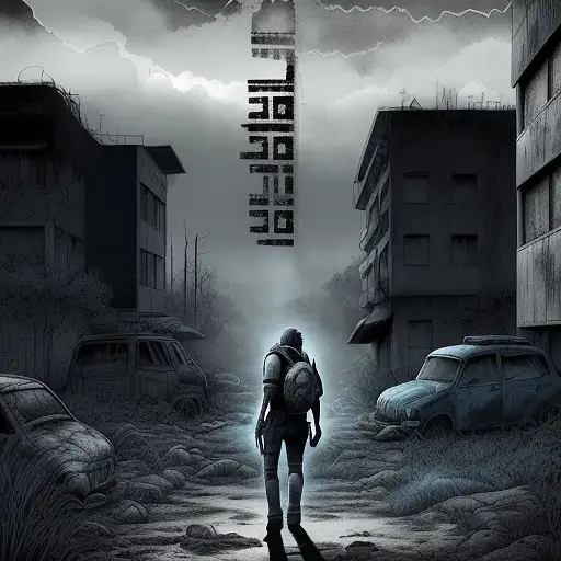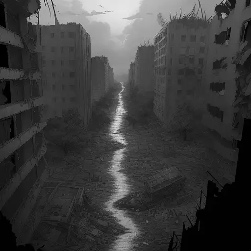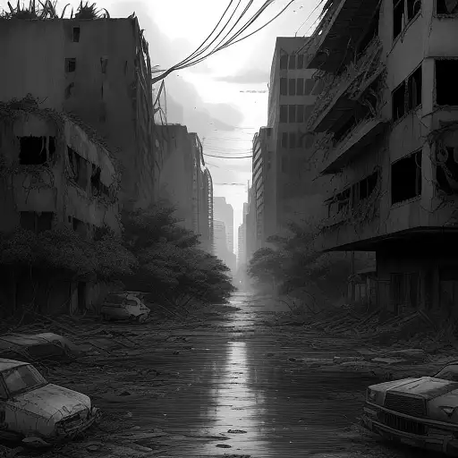 1 year ago A detailed black-and-white manga-style illustration of a post-apocalyptic scene inspired by "The Last of Us." The setting is a large city where the streets have collapsed and transformed into a river, with lush vegetation creeping over abandoned, rusty cars and crumbling buildings. The illustration should have a gray filter to enhance the sense of despair and desolation. d2e691806ce 0 57