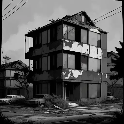 1 year ago Illustration in manga style a desolate scene of an American suburban condominium, abandoned for years in the post-apocalyptic world of 'The Last of Us,' . Traditional-style houses are overrun with wild vegetation, with trees piercing through broken roofs. Rusty cars lie scattered across deserted streets. Use strong contrast and detailed line work to capture the eerie quiet and abandonment, with the setting sun casting dramatic shadows over the scene, emphasizing the once peaceful neighborhood now lost to nature. d2e691806ce 0 36