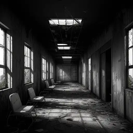 1 year ago illustration black-and-white of Interior of a hospital abandoned for decades in 'The Last of Us' style. Hallways are filled with broken medical equipment and scattered supplies. The walls are stained, peeling, and overgrown with vines. Shattered or boarded-up windows let in faint beams of light. Makeshift beds and campsites hint at occasional refuge by survivors. The atmosphere is eerily silent and somber, reflecting decades of decay and abandonment d2e691806ce 0 37