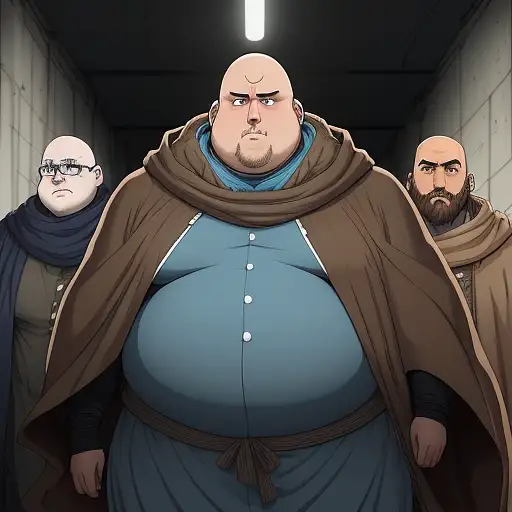 1 year ago Illustration in manga style of a tall, obese scientist with bluish-toned, flabby skin, bald and hairless, draped in a thick brown cloak, leads an underground group in a future apocalyptic setting. His keen gaze reveals unwavering determination to maintain control at all costs d2e691806ce 0 35