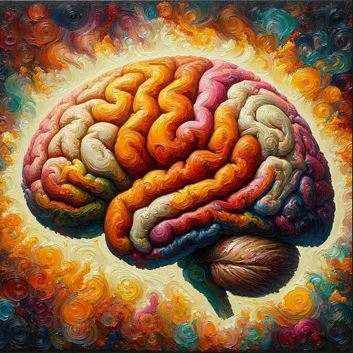 over 1 year ago Create an image that closely resembles the provided example of a human brain depicted from a side view. The brain should be illustrated using an impasto oil painting technique, which gives a thick, textured appearance to the brushstrokes, adding a three-dimensional effect to the image. The color palette should be vibrant and consist of a harmonious blend of warm hues such as oranges, reds, and yellows, with subtle hints of cool tones to provide contrast and depth. The gyri and sulci of the brain should be highly detailed and anatomically positioned, with each convolution richly highlighted by the thick application of paint. The background should feature a swirl of colors that complements the central subject, contributing to the overall impressionistic style of the piece. The final artwork should convey the intersection of artistic creativity and anatomical precision. dSave 1 140