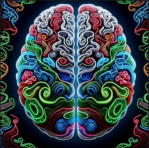 over 1 year ago Create an image showcasing the hemispheres of the human brain from a top view, where the brain's convolutions are represented as intricate neon ribbons in the national Tatar colors: green, red, blue, and white. These ribbons should accurately match the brain's anatomical structure, displaying a detailed and precise picture of the brain's gyri and sulci, turning them into an incredibly complex Tatar pattern. The neon ribbons should intertwine complexly, forming stylized traditional patterns, such as flowers and geometric shapes, that smoothly transition into each other, creating a sense of unity and turning the brain's complex structure into a piece of art where science meets national heritage. The background should be dark to enhance the neon ribbons' glow effect and to highlight their detail and precision. dSave 0 130