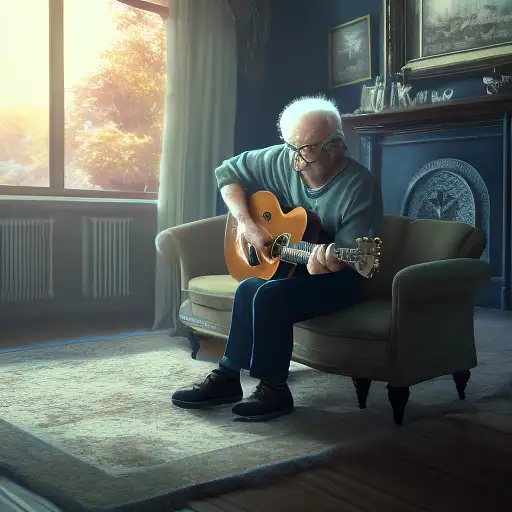 over 2 years ago Old man sitted in sofa, playing guitar, pale sunrise, cinematic lighting, battered, low angle, trending on artstation, 4k, hyper realistic, focused, extreme details, unreal engine 5, cinematic, masterpiece, art by studio ghibli, intricate artwork by john william turner danhero 0 67