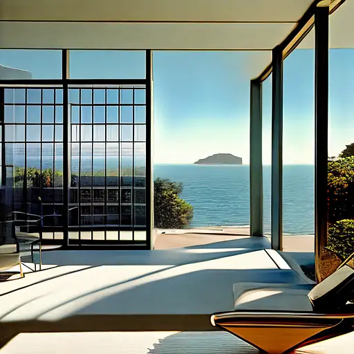 2 years ago Hyper realistic eye level exterior photo of a mid century modern style house overlooking the ocean, daylight, indirect lighting, AD magazine, Frank Lloyd, Eames, Mies van der Rohe darkenway 0 43