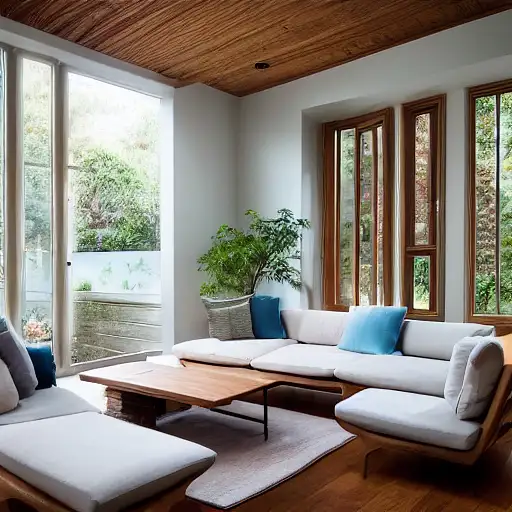 over 2 years ago high resolution photography interior design, dreamy sunken living room conversation pit, wooden floor, small windows opening onto the garden, bauhaus furniture and decoration, high ceiling, beige blue salmon pastel palette, interior design magazine, cozy atmosphere darkenway 0 72