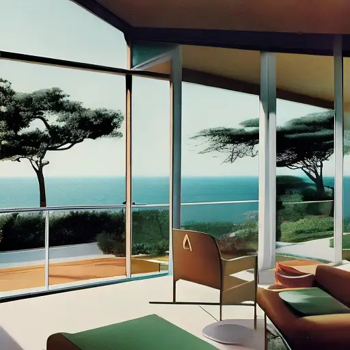 2 years ago Hyper realistic eye level exterior photo of a mid century modern style house overlooking the ocean, daylight, indirect lighting, AD magazine, Frank Lloyd, Eames, Mies van der Rohe dionatthan 0 51