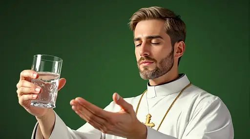 8 months ago A 33-year-old male priest of Latin appearance, charming with an intellectual air, his easy expression is serene and welcoming, well-groomed with a short beard, light brown hair, and greenish eyes. He is holding a transparent glass of crystal-clear water in one hand and the other arm is extended with the palm down, as if blessing someone by touching their head. His expression is serene but concentrated, with his mouth closed and eyes closed in total concentration. His vestments are those of a priest in white with a neck chain with a gold crucifix. The background is a solid leaf-green color. Ultra-realism in the scene, 8K resolution. Seed: 291640607 Negative Prompt: (no deformation, no anime) dionatthan 0 31