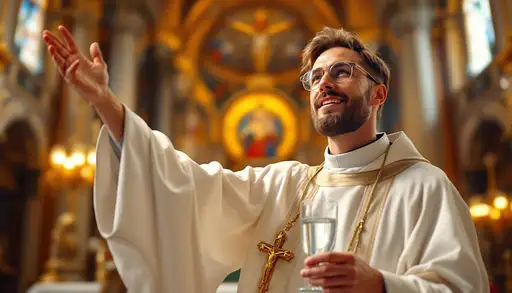 8 months ago A 33-year-old male priest of Latin appearance, charming, wearing glasses with an intellectual air. His expression is serene, charming, and welcoming. He is well-groomed with a short beard and light brown hair. The priest is standing with one arm extended in praise to God and the other hand holding a glass of crystal-clear water. He wears white priestly vestments with a neck chain with a gold crucifix. The background is the altar of the Cathedral of Seville, Spain, in a celestial, religious atmosphere. The scene should be ultra-realistic, in 8K resolution. Seed: 291640607 Negative Prompt: (no deformation, no anime) dionatthan 0 37