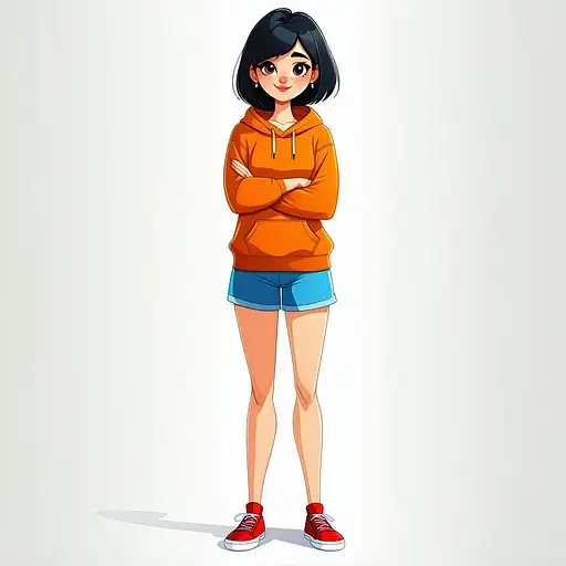 4 months ago cartoon-style illustration of a short adult woman (150cm) with youthful, petite body proportions, slim build, flat chest, narrow hips, delicate face, short black bob haircut, big expressive eyes, wearing an orange hoodie with short blue shorts and red sneakers, arms crossed confidently, standing on a neutral background, soft cel shading dokyzera 0 25