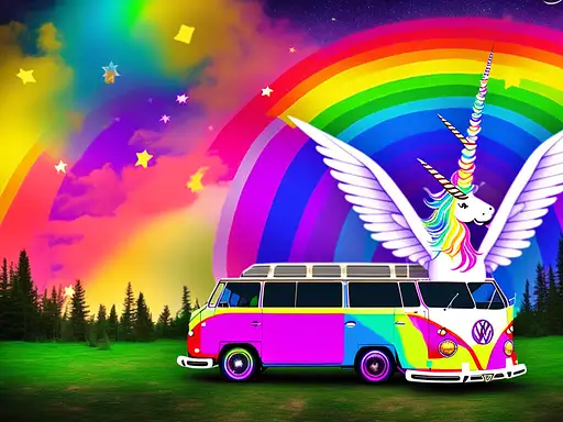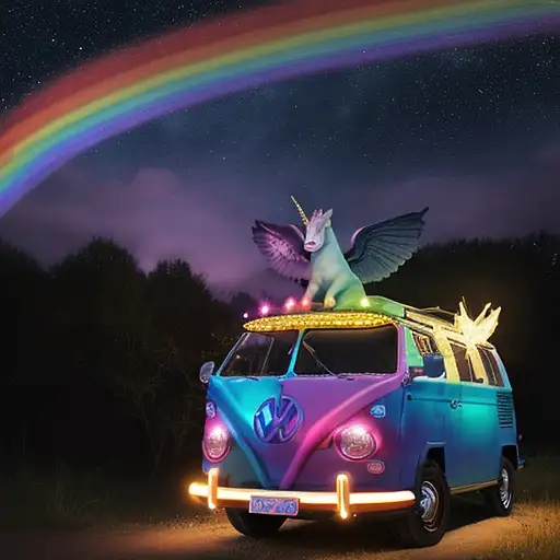 almost 2 years ago rainbow VW bus with unicorn wings in front of campfire under stars, flying over rainbow e384910035b 0 99
