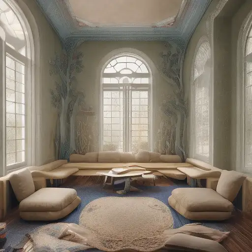almost 2 years ago High resolution photography interior design, dreamy sunken living room conversation pit, wooden floor, small windows opening onto the garden, bauhaus furniture and decoration, high ceiling, beige blue salmon pastel palette, interior design magazine, cozy atmosphere; 8k, intricate detail, photorealistic, realistic light, wide angle, kinkfolk photography, A+D architecture e384910035b 0 83