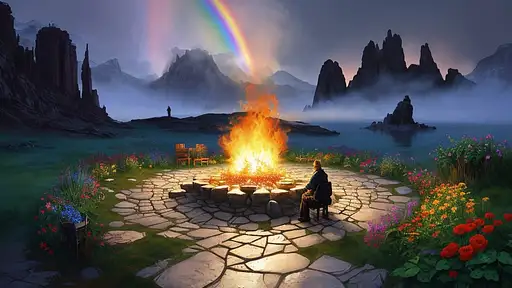 almost 2 years ago a retro future shaman building up colorful flaming energy on his hands, Ben Erdt, Ognjen Sporin, Raphael Lacoste. A garden of oversized flowers, with a Fire made of rainbow-colored stepping stones. 8k. Discover a charming and magical world in this landscape. Imagine a place where flowers shine in all the colors of the rainbow, shaman with purple coat sitting next to bonfire e384910035b 0 62