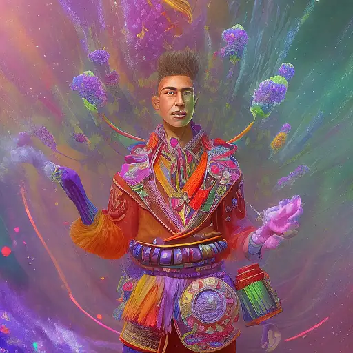almost 2 years ago a retro future shaman with purple coat building up colorful flaming energy on his hands, . A garden of oversized flowers, with a campfire made of rainbow-colored rays. 8k. Discover a charming and magical world in this landscape. Imagine a place where flowers shine in all the colors of the rainbow. watercolors e384910035b 1 95