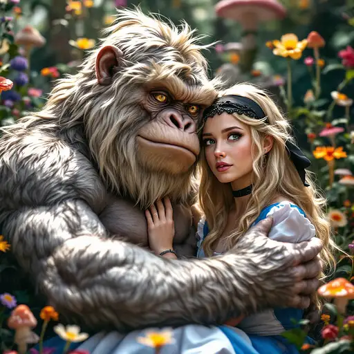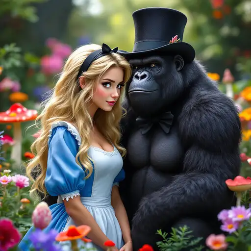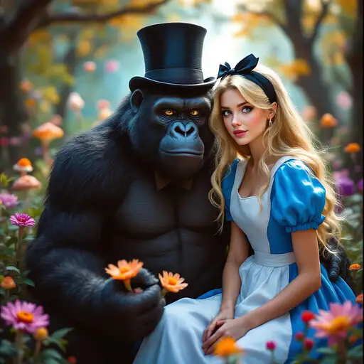 9 months ago High resolution and realistically photogenic, Alice in wonderland in her traditional blue dress and black head band with long blonde hair showing her muscles with her silver back gorilla who wears a top hat and had big muscles, the background is full of vibrant flowers, mushrooms, enchanted in wonderland theme e4862cabc5e 0 30