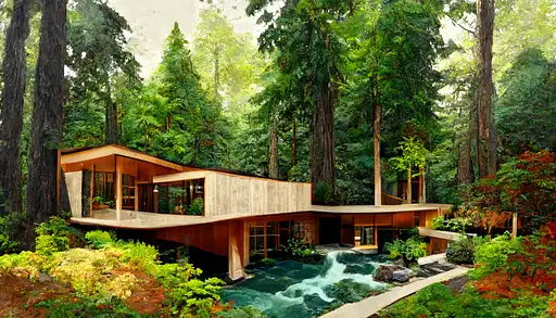3 years ago natural wood modern house in the side of a forest hill side, frank lloyd write style, small pond with waterfall, stone walkways, tall redwood trees, clean straight lines, realistic, --ar 16:9 Midjourney 86 190