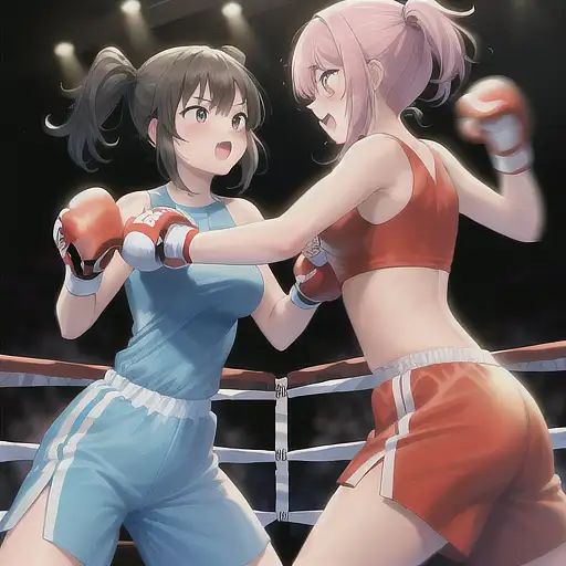 over 2 years ago Painting of 2 girls fighting each other in a boxing ring for the championship. Each are wearing helmets and punching gloves. eclipze 0 81