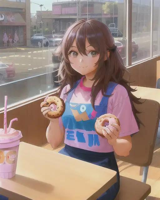 over 2 years ago 1girl, painting of a girl sitting in a dunkin donuts, eating a pink donut, sprinkles on donut, DUNKIN sign, window shows parking lot, clean area, small table, comfy outfit, brown wooden pattern on floor, gray wall, afternoon, natural hair color and eyes, anime, anime face, art by artgerm and greg rutkowski and alphonse mucha, 8k, artgerm anime, professionally color graded, depth of field eclipze 0 84