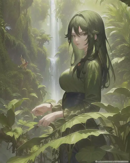 over 2 years ago Masterpiece painting of a girl in the jungle, rainforest, many birds, green outfit, jeans, outdoors, vines, much water, natural hair color, anime, anime face, art by artgerm and greg rutkowski and alphonse mucha, 8k, artgerm anime, professionally color graded, depth of field, hdr eclipze 0 69