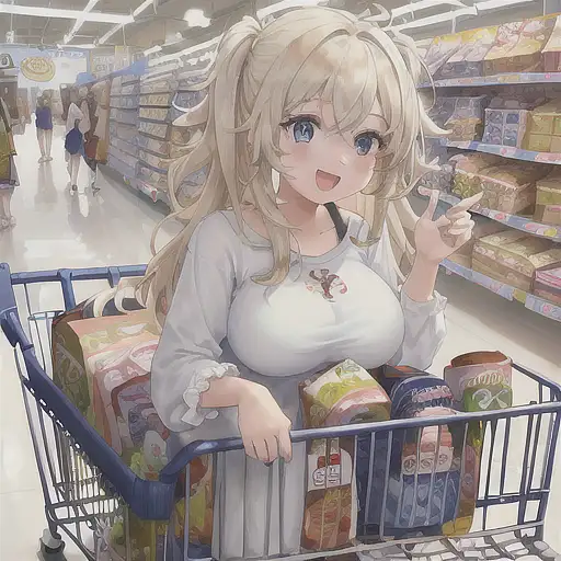 over 2 years ago 1girl, painting of a girl pushing a shopping cart in walmart, food water and essentials in shopping cart, happy, casual outfit, shelves of food and more, people shopping in background, white floor, walmart, indoors, natural hair and eye color, anime, anime face, art by artgerm and greg rutkowski and alphonse mucha, 8k, artgerm anime, professionally color graded, depth of field, breast eclipze 0 87