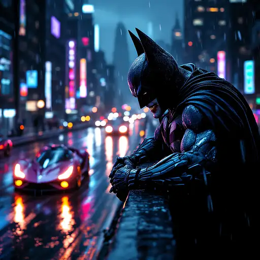 8 months ago In the heart of Gotham, under a dimly lit, rain-soaked bridge, the tension crackled like electricity. A close-up captures Batman, draped in his iconic dark cape, muscles taut with intensity. The light from the neon cityscape glints off his armor, emphasizing the deep shadows that tell tales of countless battles fought. He grips the Joker by his collar, the Joker's maniacal grin stark against the chaos of the night. The reflection of the city dances in the puddles below, mirroring their precarious position. Behind them, sleek futuristic vehicles with glowing wheels zip past on the slick wet streets, their polished surfaces capturing the shimmer of neon lights, adding an almost surreal backdrop to a scene that is all too real. The rain falls like a curtain, enhancing the dramatic tension between the Dark Knight and his greatest foe. With Gotham as their backdrop, Batman leans over the edge of the bridge, eyes burning with determination. The wind tousles his cape as he stares into the chaos of the Joker's mind, a dangerous game played on the precipice of justice and madness. ed040415261 0 29