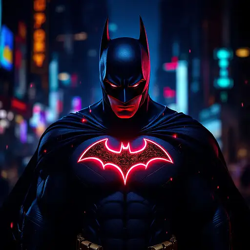 8 months ago Imagine me as Batman and the chest logo is bright glowing neon style and a cinematic shot Emphasize Batman's tactical genius and strategic planning, showcasing his ability to outsmart villains and protect Gotham City. 4k ed040415261 0 52