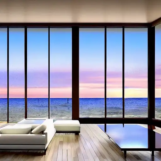 over 2 years ago a hyper realistic photo of my dream home at the ocean beachfront with lots of big windows in modern style at sunrise, big waves, by Ernest Hamlin Baker eggressive 0 91