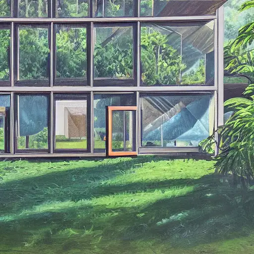 over 2 years ago an oil painting of a beautiful house where walls are made of windows in mid-century modern style at daytime inside of a forest and full of trees and plants with intricate details, wide angle eggressive 1 110