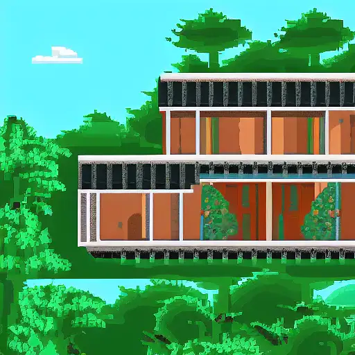 over 2 years ago a pixel art of a beautiful house where walls are made of windows in mid-century modern style at daytime inside of a forest and full of trees and plants with intricate details eggressive 1 77
