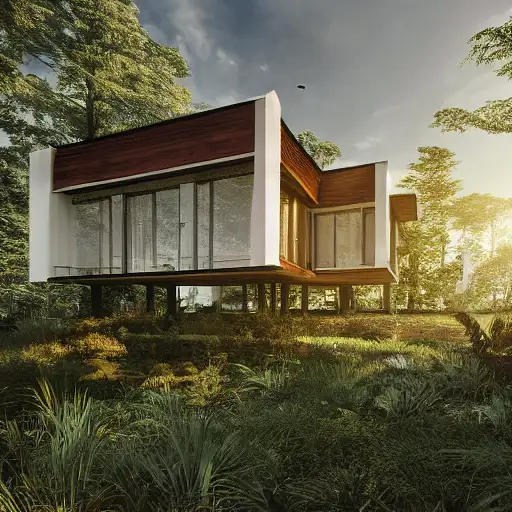 over 2 years ago an digital art of a beautiful house where walls are made of windows in mid-century modern style at daytime inside of a forest and full of trees and plants with intricate details, wide angle, Octane render eggressive 0 110