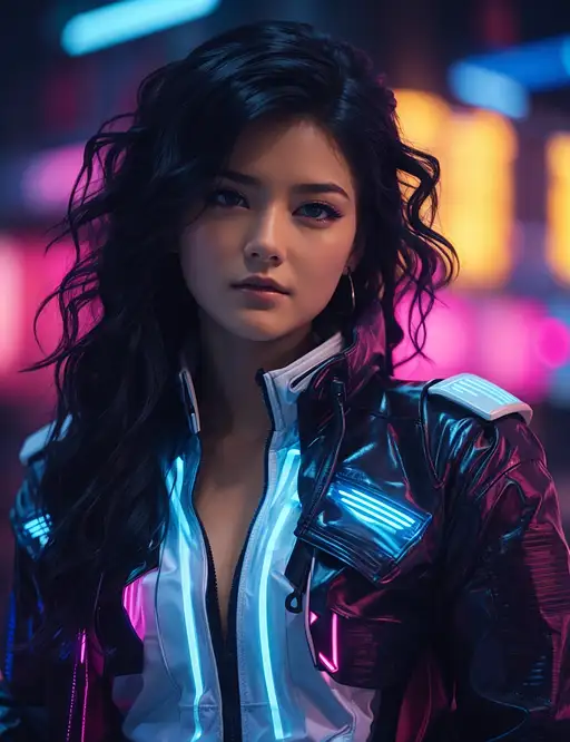 almost 2 years ago a woman in a shiny jacket posing for a picture, cyberpunk art by Lü Ji, trending on cg society, retrofuturism, glowing neon, futuristic, synthwave elielborges 9 390