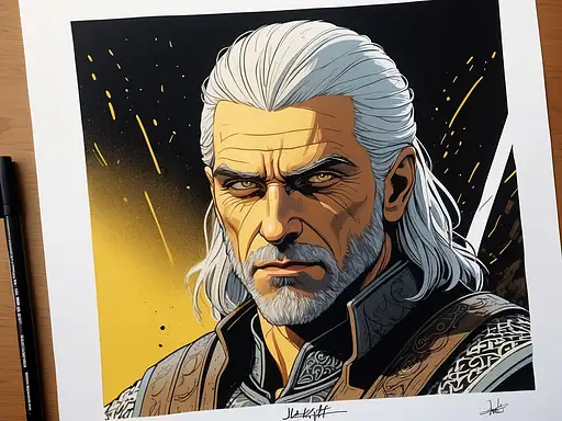 almost 2 years ago midshot, cel-shading style, centered image, ultra detailed illustration of Geralt de Rivia, (he has yellow iris) (tetradic colors), inkpunk, ink lines, light particles, strong contours, art nouveau a character portrait by Pogus Caesar, Artstation, symbolism, 2d game art, official art, Ilya Kuvshinov elielborges 4 240