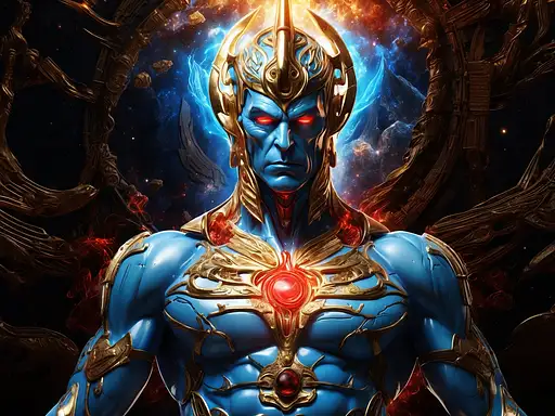 almost 2 years ago High-resolution artwork, detailed depiction of Captain Atom as a majestic Pharaoh God, golden armor adorned with intricate hieroglyphs, radiant blue energy emanating from his body, regal headdress with a cobra emblem, glowing red eyes, muscular physique, imposing presence, floating above a grand pyramid, surrounded by an aura of cosmic power, celestial background with swirling galaxies and stars, divine symbols etched into the sky, majestic sun rays casting a divine glow, masterfully crafted by a renowned artist, capturing the essence of Captain Atom's godlike transformation. elielborges 0 87