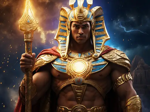 almost 2 years ago High-resolution artwork, detailed depiction of Captain Atom as a majestic Pharaoh God, golden armor adorned with intricate hieroglyphs, radiant blue energy emanating from his body, regal headdress with a cobra emblem, glowing red eyes, muscular physique, imposing presence, floating above a grand pyramid, surrounded by an aura of cosmic power, celestial background with swirling galaxies and stars, divine symbols etched into the sky, majestic sun rays casting a divine glow, masterfully crafted by a renowned artist, capturing the essence of Captain Atom's godlike transformation. elielborges 4 170