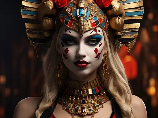 almost 2 years ago A breathtaking artwork featuring Harley Quinn as a captivating Pharaoh God, a true masterpiece that combines her playful nature with regal power. Harley Quinn adorned in an elaborate golden headdress, embellished with vibrant colors, feathers, and jewels. Her face painted with intricate hieroglyphic patterns, showcasing her mischievous spirit. Dressed in a unique ensemble that blends ancient Egyptian motifs with her signature style, incorporating red and black accents. Holding a golden staff adorned with jester-like details, symbolizing her unpredictable nature. Surrounding her, a backdrop of ancient pyramids and a sun-soaked desert, with a vibrant sky showcasing a mesmerizing sunset. The artwork, created with meticulous attention to detail, brings forth the essence of Harley Quinn's character as a Pharaoh God, a captivating blend of beauty, chaos, and playfulness. elielborges 2 170