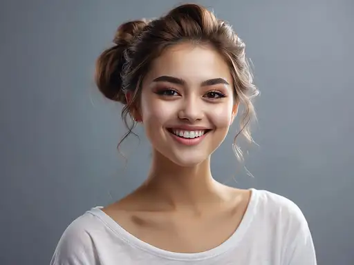 almost 2 years ago a woman with a messy bun smiling at the camera, a stock photo by Lü Ji, featured on cg society, cloisonnism, white background, studio portrait, contest winner elielborges 4 230
