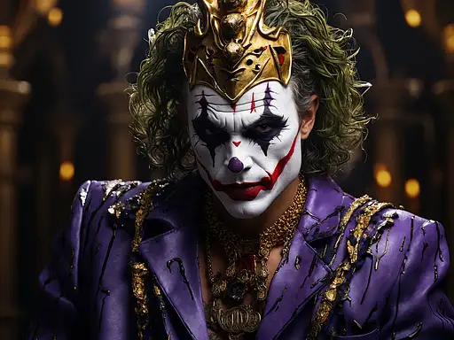 almost 2 years ago A mesmerizing artwork depicting the Joker transformed into a malevolent Pharaoh God, a true masterpiece that captures his chaotic essence. The Joker adorned in an extravagant golden headdress, adorned with twisted symbols and eerie motifs, reflecting his twisted mind. His face painted with a sinister combination of vibrant colors, showcasing his maniacal nature. Dressed in a regal robe with a tattered and worn appearance, representing his anarchic tendencies. Holding a scepter with a menacing grin at its tip, symbolizing his control over chaos. Surrounding him, a backdrop of ancient Egyptian ruins and a foreboding sky, crackling with purple lightning and ominous clouds. The artwork, created with meticulous attention to detail, showcases the Joker's transformation into a Pharaoh God, a chilling embodiment of madness and mayhem. elielborges 3 140
