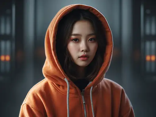 almost 2 years ago a woman in an orange hoodie looking at the camera, a photorealistic painting by Sim Sa-jeong, featured on cg society, sots art, studio portrait, studio photography, minimalist elielborges 1 61
