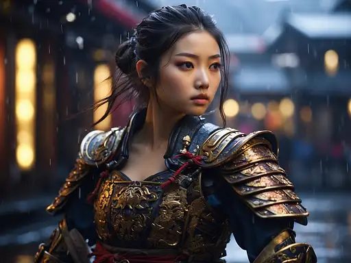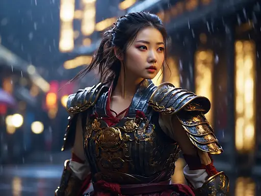 almost 2 years ago a woman dressed in a costume standing in the rain, a photorealistic painting by Huang Guangjian, cgsociety, fantasy art, movie still, anime aesthetic, reimagined by industrial light and magic elielborges 0 66