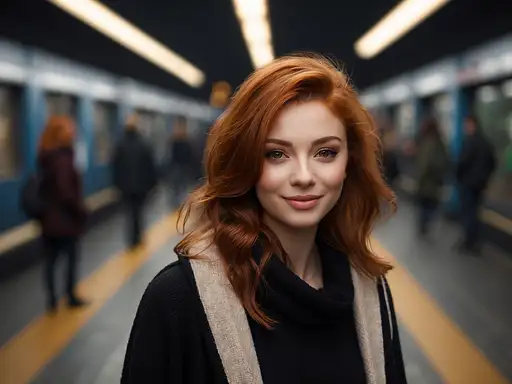 almost 2 years ago a woman with red hair standing in a train station, a character portrait by Radi Nedelchev, featured on cg society, neo-figurative, shallow depth of field, bokeh, anamorphic lens flare elielborges 7 230